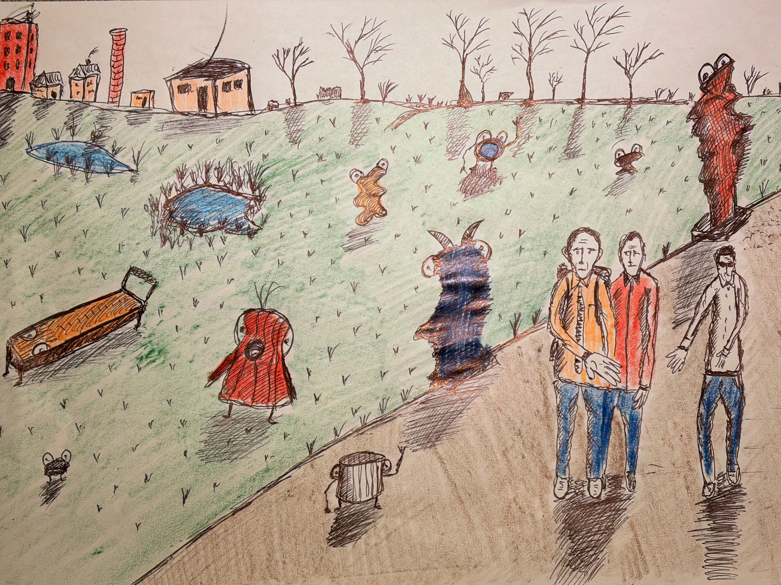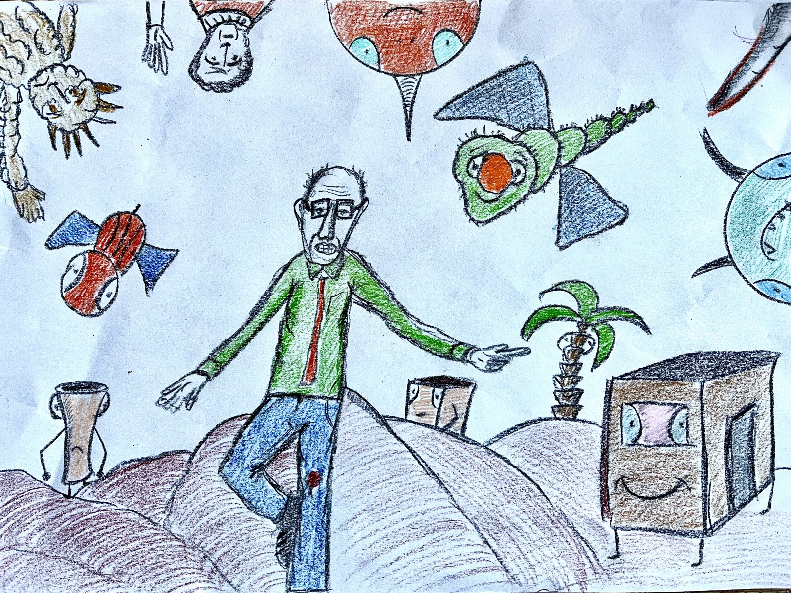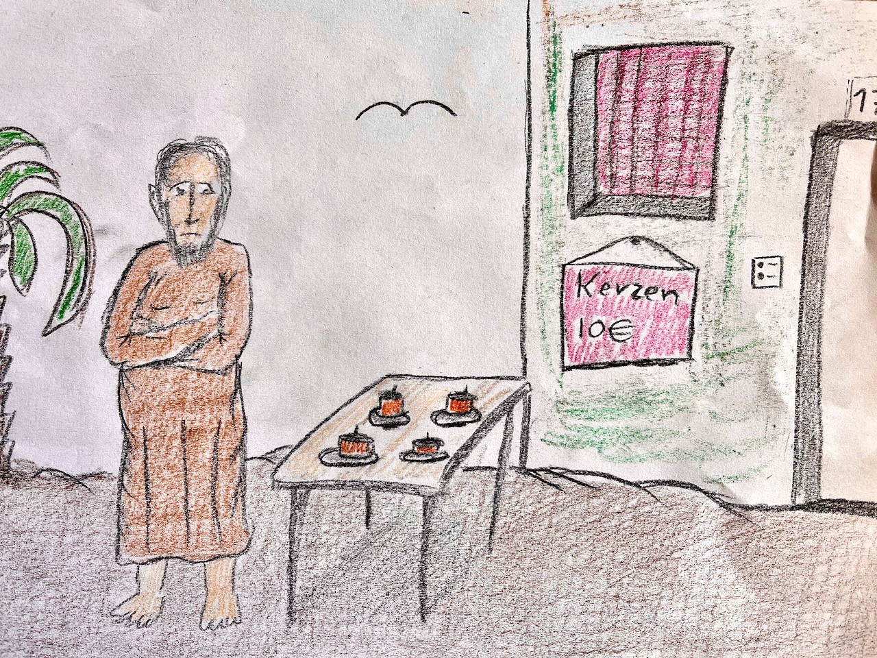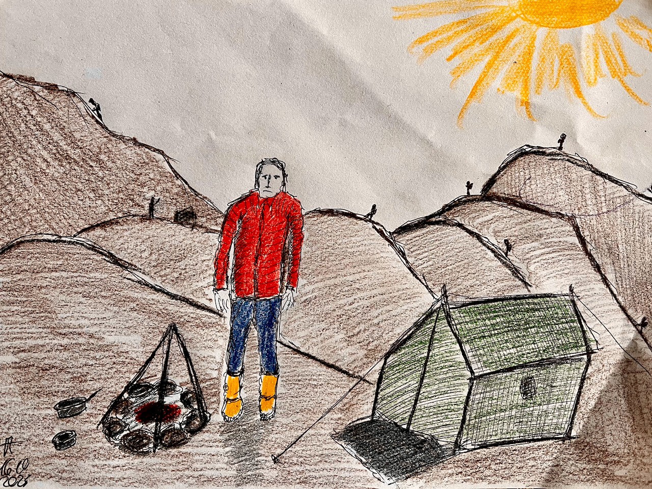 Wenn ich so acht Stunden jeden Tag mt Kindern arbeite, dann setzte ich mich einfach an einen viel zu kleinen Tisch und beginne zu zeichnen, eben at work. Sehr schnell setzten sich Kinder zu mir und beginnen auch zu malen. Dann kommen fragen: „Was malst Du?“ „Bist Du das?“ oder „Malst Du mir ein Auto?“. Die meisten Bilder entstehen nicht an einem Tag, es ist ja während der Arbeit. Aber immer, wenn es sich ergibt male ich an dem Bild weiter und so sind schon einige Bilder zusammen gekommen.