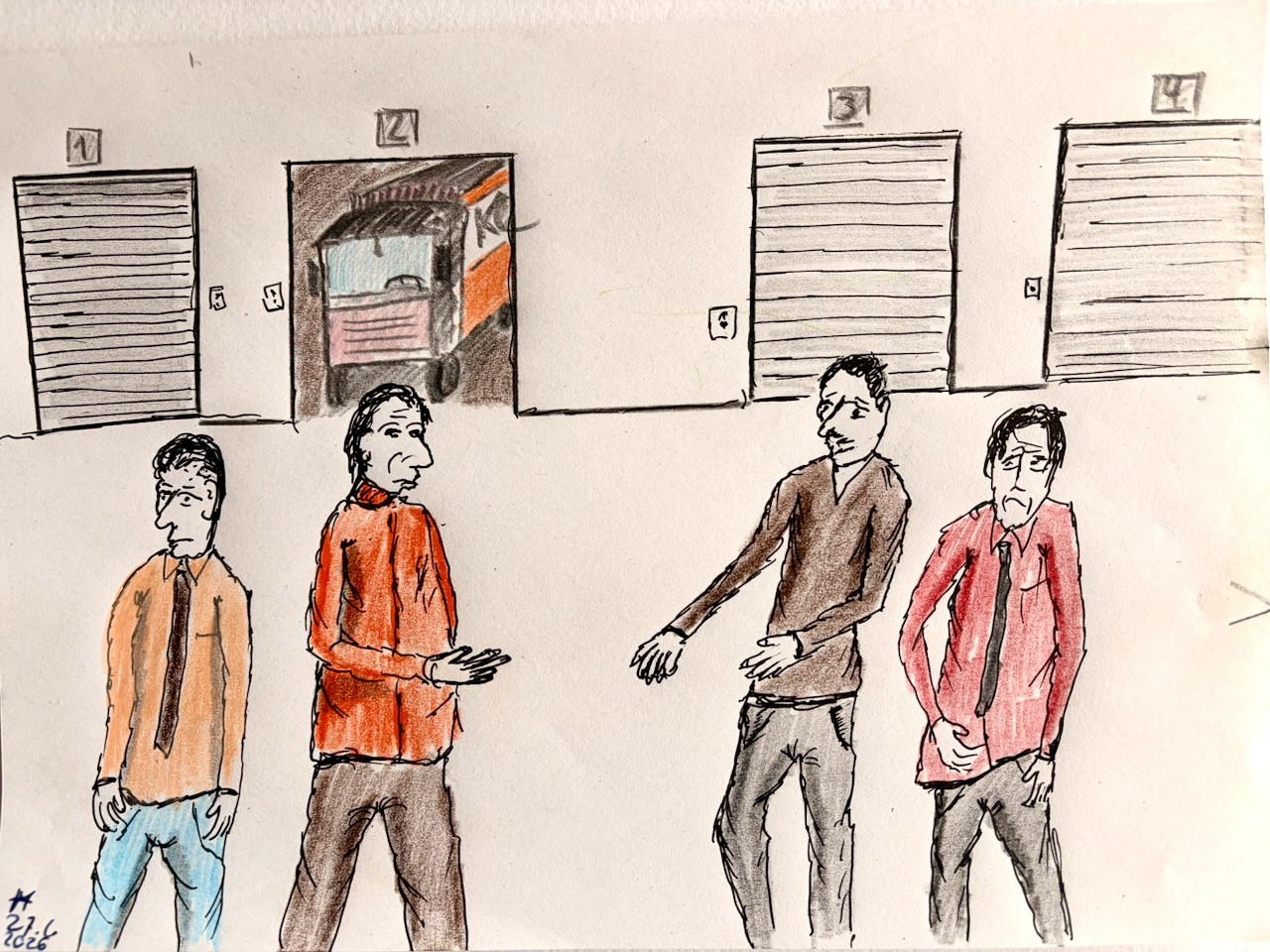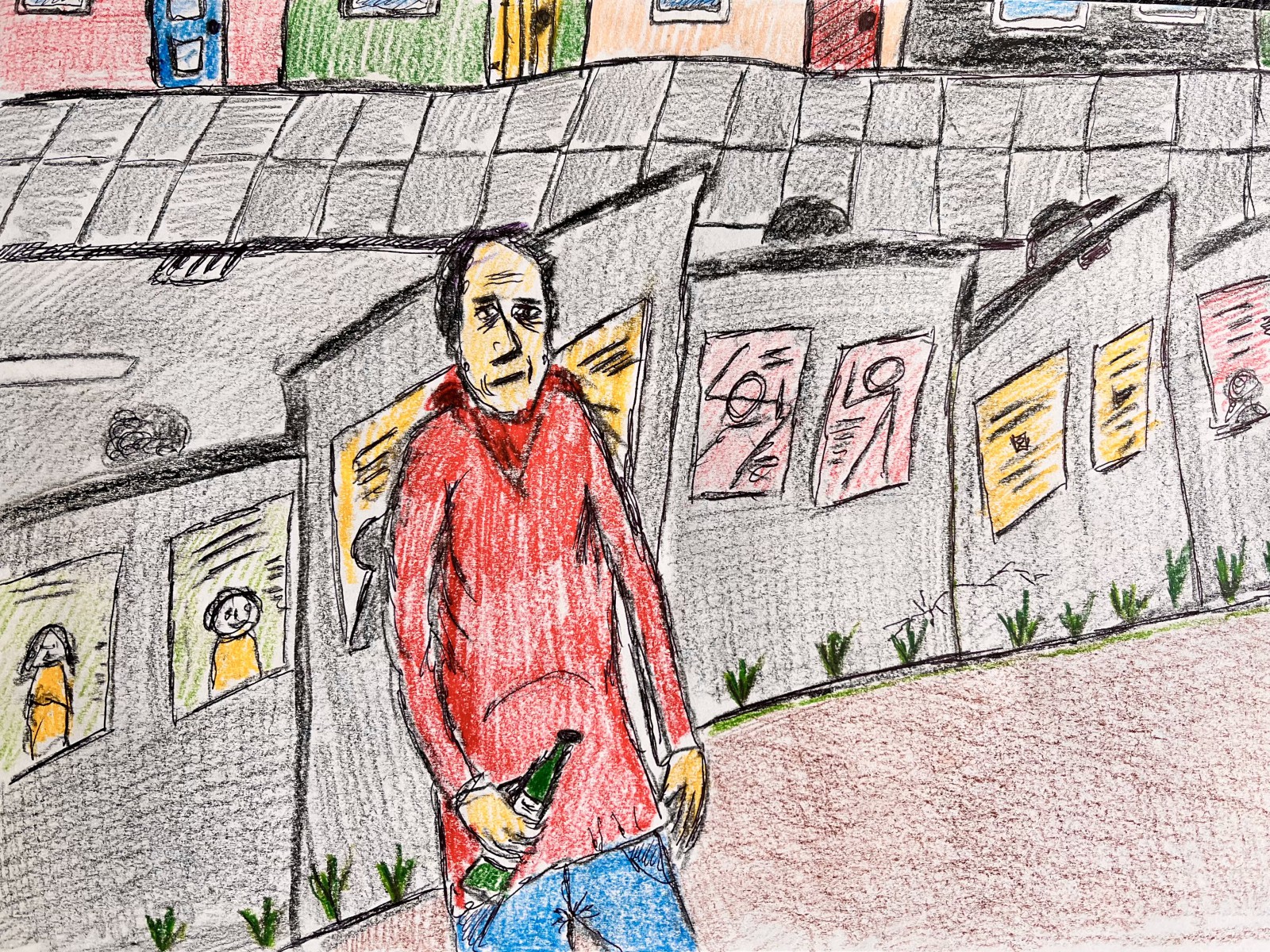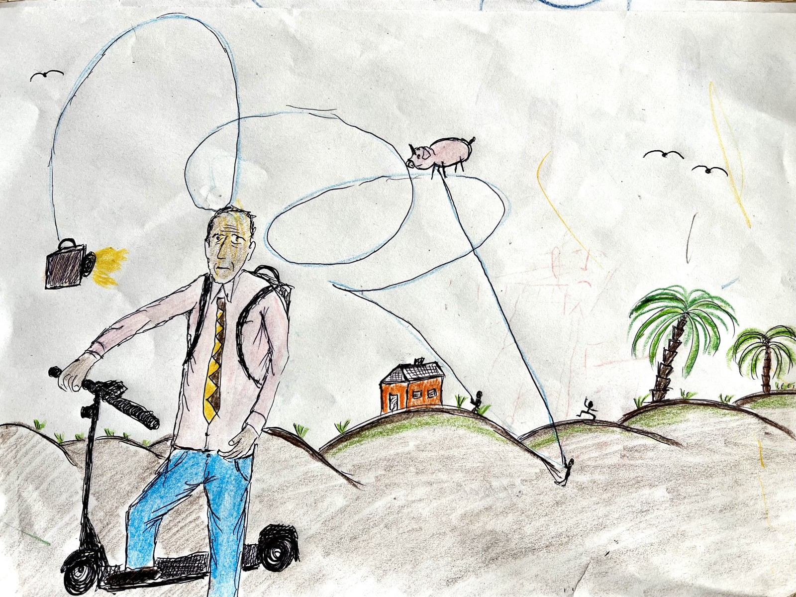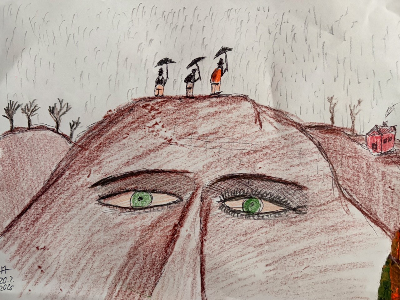Wenn ich so acht Stunden jeden Tag mt Kindern arbeite, dann setzte ich mich einfach an einen viel zu kleinen Tisch und beginne zu zeichnen, eben at work. Sehr schnell setzten sich Kinder zu mir und beginnen auch zu malen. Dann kommen fragen: „Was malst Du?“ „Bist Du das?“ oder „Malst Du mir ein Auto?“. Die meisten Bilder entstehen nicht an einem Tag, es ist ja während der Arbeit. Aber immer, wenn es sich ergibt male ich an dem Bild weiter und so sind schon einige Bilder zusammen gekommen.