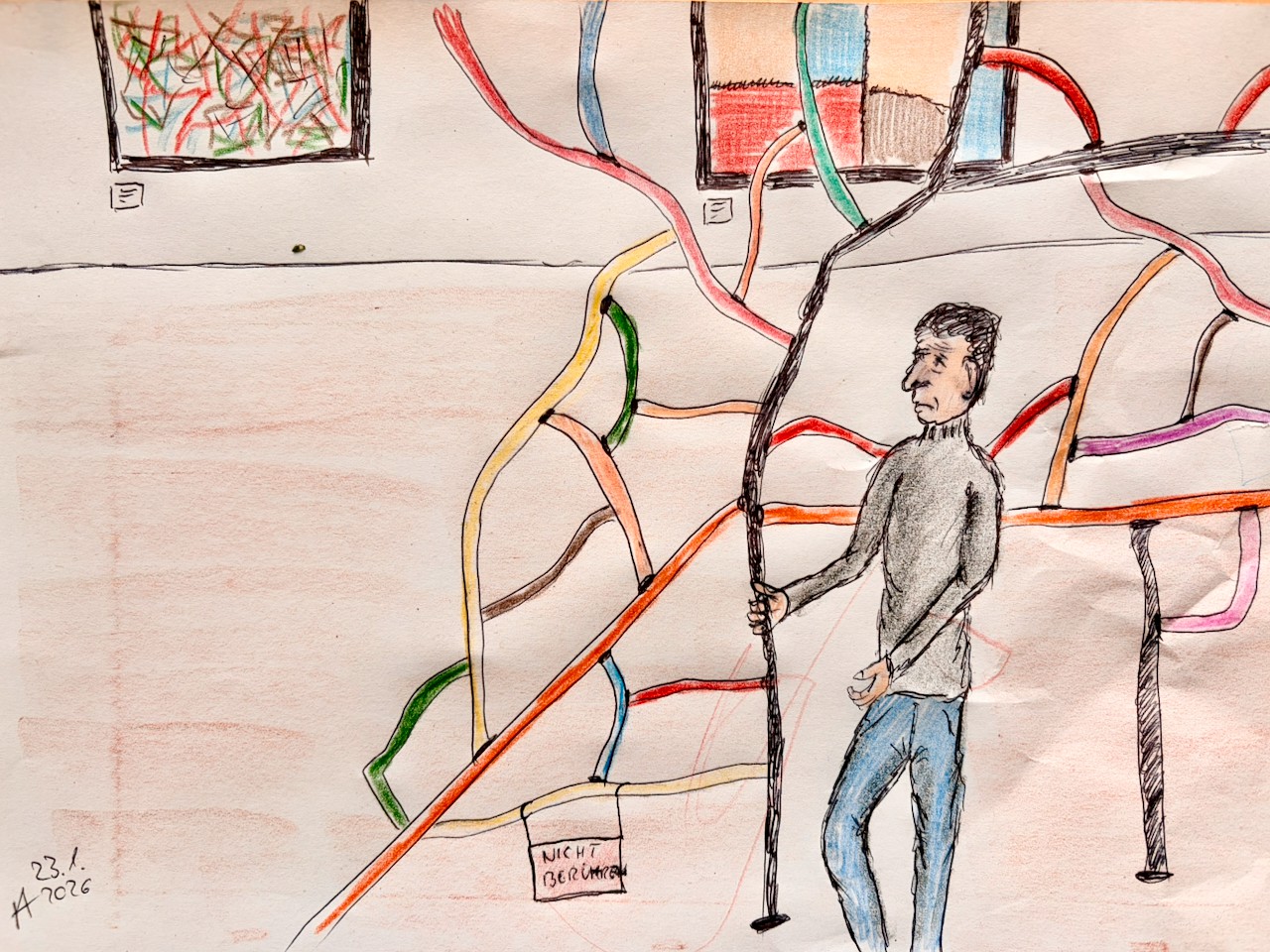 Hier sind nicht alle Zeichnungen zu sehen, denn es sind doch schon einige. Die ersten Zeichnungen sind alle ohne Farbe und waren einfache und schnelle Kritzeleien. Das hat sich alles entwickelt und nun sind es farbige Kritzeleien, die etwas mehr Zeit in Anspruch genommen haben. Die Arbeiten sollen für mich Übungen seien, auch wenn sich Fortschritte nur langsam einstellen, sie sind nicht realistisch oder „korrekt“, was auch nicht mein Anspruch ist. Es sind Zeichnungen, die eben at work entstehen und mir Spaß machen. Zudem animiere ich die Kinder dazu, sich einfach hinzusetzen und etwas malen,, ohne das es ein Thema gibt. Benutzt wird, was an Papier da ist und mein Kaweco-Roller oder auch meine Kaweco Bleistift und Füller. Leider bekomme ich kein Geld von der Firma, aber ich mag sie einfach.